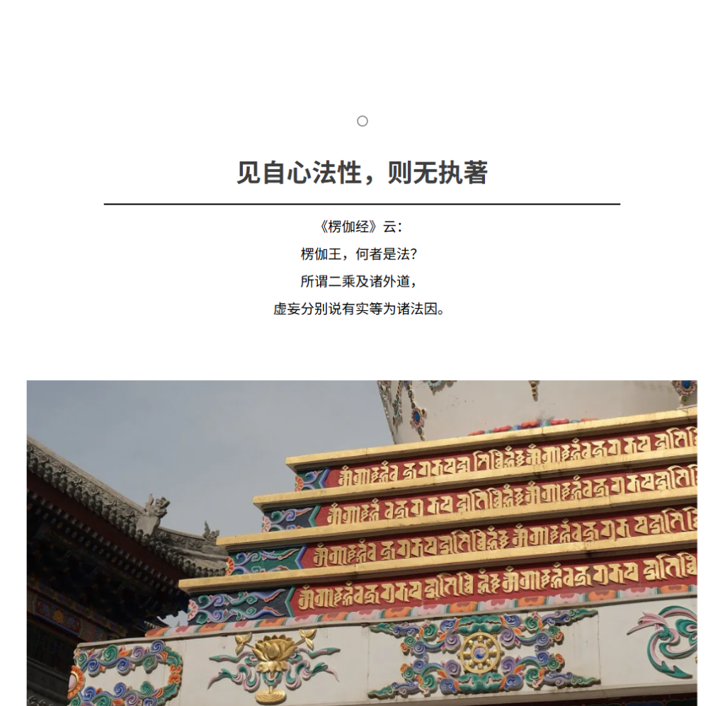 法就是外道、声闻、缘觉和凡夫的「所分别」。就是把生了翳病的眼睛显现的似毛的影误执为心外的毛,这个毛就是所分别,就是遍计所执自性,就是无明凡夫以为存在,而圣者认为根本不存在。外道、声闻、缘觉和凡夫,还认为这个所分别的法有产生的因,注意这就是世俗因果。在圣者看来,这个世俗因果就是给老王梦中的老虎找妈,是戏论。给这个毛找产生的原因就是戏论,因为毛根本不存在,不存在怎么有产生的原因?找原因也只能是为心外没有毛,可无明凡夫非误以为心外有毛的错觉找原因,为虚妄分别找原因,这就是胜义因果。外道、声闻、缘觉和凡夫,还说这所分别的法原本就是真实存在,还有作用。佛陀说这样所分别的法应该舍离,不应该执著所分别的法的相。怎么才能做到不执著所分别的法的相?经文「见自心法性,则无执著」,就是知道所分别的法的根本特征是自心的显现,就不会再执著了。注意是显现,不是产生。「瓶等诸物,凡愚所取,本无有体」,佛说就是瓦罐之类的心外之物,是凡夫的遍计所执,存在性根本没有。「本无有体」梵文是alabdhaśarīra,直译就是身体无所得,就是瓦罐根本没有身体,就是存在性根本没有。 【欢迎扫码加入学习】 整理 丨 蜀华、大码头审核 丨 悟缘起、燕子、梁统筹 丨 轻灵图片 丨 王子 编辑发布 丨 五色草 相关 文章导航 Previous PostPrevious 成佛到底要多久?Next PostNext 凡夫堕在种种相中