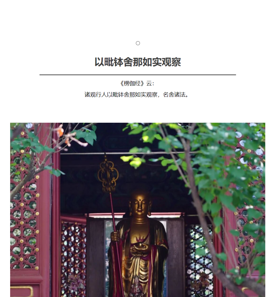 前面也讲过,这个「止」梵文是śamatha,那么这里出现的vipaśyanā就是观。vipaśyanā音译为「毗钵舍那」,意译为「观」,有的翻译家翻译成智观、妙观、内观。这里的「诸观行人」指的是登初地到七地的修行者。修行者以智观,如实观察诸法。